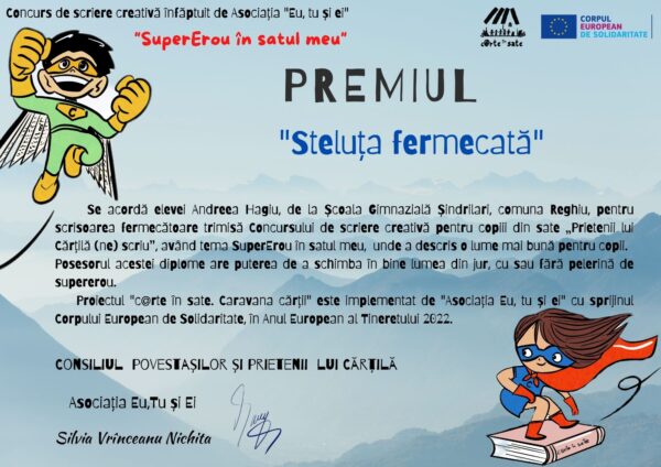 Compunere trimisă de Andreea Hagiu, elevă în clasa a III-a, la Școala Gimnazială din Reghiu, prof. coord. Mia Chipăilă, pe adresa Concursului de scriere creativă pentru copiii din sate „Prietenii lui Cărțilă (ne) scriu”, organizat în cadrul programului c@rte în sate. #Caravanacărții, cu sprijinul Corpului European de Solidaritate, care a avut tema #SuperErou în satul meu.