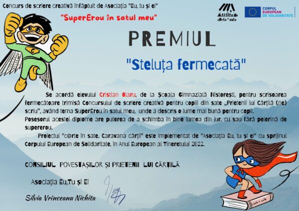 Eu dacă aș fi un erou în satul meu Nistorești, județul Vrancea, aș ajuta toți copiii cu dizabilități din comuna mea și din toată țara, ca să poată avea acces la școală. Aș mai face un centru pentru toți copiii care au nevoie de logoped și consiliere psihologică, pentru că sunt foarte mulți copii în țară și în lume care sunt maltratați de părinți și care au nevoie de ajutor. Aș încuraja toți copii săraci să meargă la școală, pentru că educația este sfântă. Aș mai face multe lucruri în satul meu Nistorești, cum ar fi acelea apei care este foarte importantă. Aș mai face cale de acces la locuințele din satul meu din întreaga lume pentru că sunt mulți săteni care au nevoie de salvare. Eu chiar îmi doresc să fiu un supererou în satul meu.”