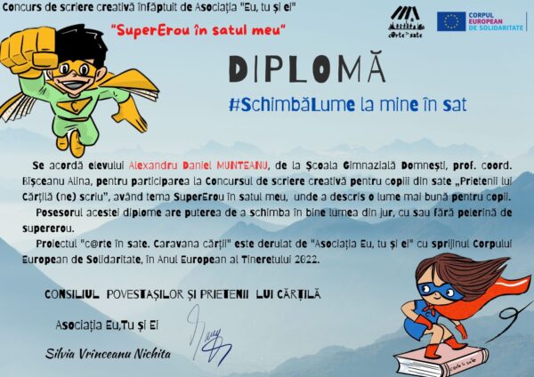 Compunere trimisă de Alexandru Daniel Munteanu, elev la Școala Gimnazială Domnești, comuna Pufești, prof. coord. Bîșceanu Alina Gabriela, pe adresa Concursului de scriere creativă pentru copiii din sate „Prietenii lui Cărțilă (ne) scriu”, organizat în cadrul programului c@rte în sate. #Caravanacărții, cu sprijinul Corpului European de Solidaritate, care a avut tema #SuperErou în satul meu.