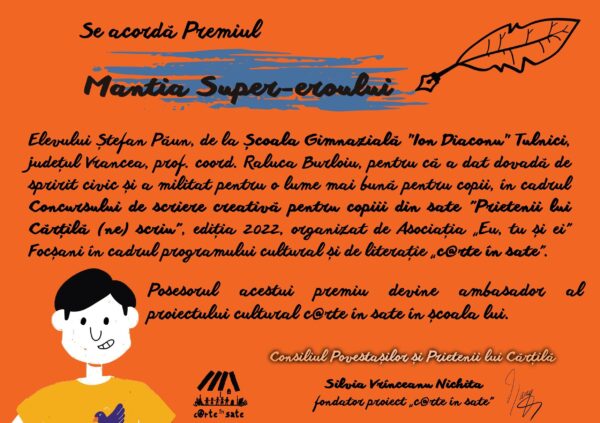 Scrisoarea lui Ștefan Păun a fost răsplătită cu Premiul special „Mantia SuperEroului’’.
