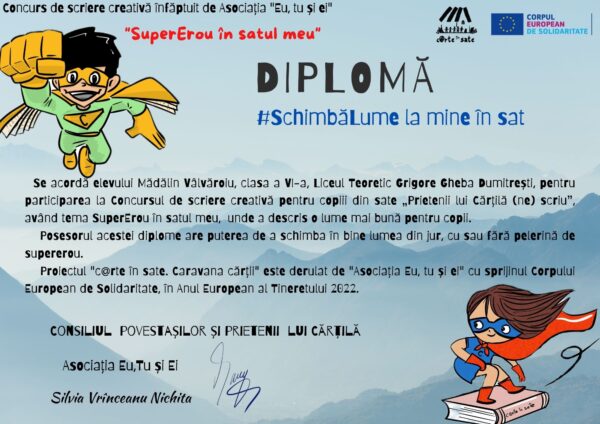 I-a la Liceul Teoretic Grigore Gheba Dumitrești, prof. coord. Nicoleta Galoiu, pe adresa Concursului de scriere creativă pentru copiii din sate „Prietenii lui Cărțilă (ne) scriu”, organizat în cadrul programului c@rte în sate. #Caravanacărții, cu sprijinul Corpului European de Solidaritate, care a avut tema #SuperErou în satul meu.