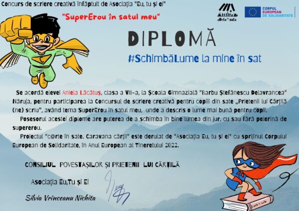 Compunere trimisă de Aniela Lăcătuș, elevă în clasa a VIII-a, la Școala Gimnazială „Barbu Ștefănescu Delavrancea”, pe adresa Concursului de scriere creativă pentru copiii din sate „Prietenii lui Cărțilă (ne) scriu”, organizat în cadrul programului c@rte în sate. #Caravanacărții, cu sprijinul Corpului European de Solidaritate, care a avut tema #SuperErou în satul meu.