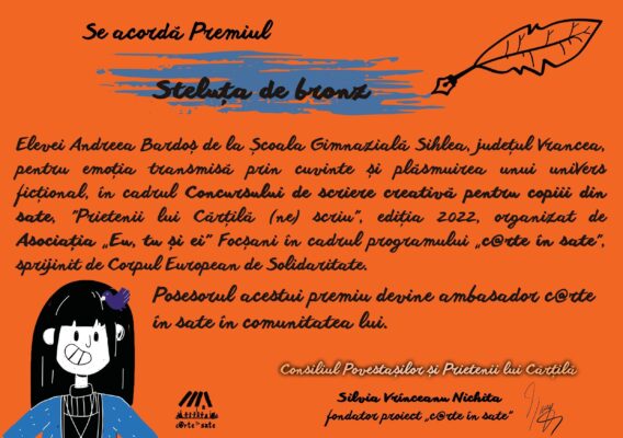 Scrisoare trimisă de Andreea Bardoș, pe adresa Concursului de scriere creativă pentru copiii din sate „Prietenii lui Cărțilă (ne) scriu”, organizat în cadrul proiectului c@rte în sate. Caravana cărții, care a avut tema SuperErou în satul meu. Andreea este elevă in clasa a VII-a, la Școala Gimnazială ,,Principele Șerban Ghica și Principesa Aristita Ghica’’ Sihlea, Județul Vrancea. Îndrumătoarea micuței scriitoare a fost profesoara ei de limba română Cristina Ene Bărbosu. Scrisoarea Andreei a fost premiată cu Premiul literar „Steluța de bronz” și intră în cursa pentru premiul de popularitate care va fi acordat de Ziua Copilului 2023.