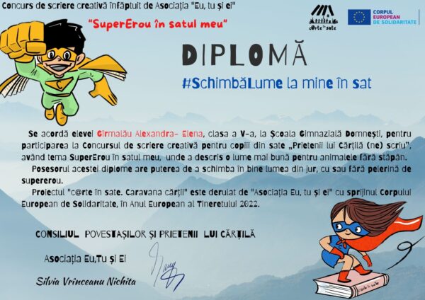 Mă numesc Gîrmalău Alexandra- Elena, am 12 ani și sunt elevă în clasa a V-a de la Școala Gimnazială Domnești, comuna Pufești și vă trimit această scrisoare pentru Concursul de scriere creativă pentru copiii din sate „Prietenii lui Cărțilă (ne) scriu”. Sunt o fetiță cu părul lung și blond, ochii verzi și port ochelari. Ca pasiuni pot spune că am pictura, mersul pe bicicletă iar de la începutul clasei a V-a, sub îndrumarea doamnei profesoare de limba română Bîșceanu Alina Gabriela, am început să iubesc lectura. Ador școala, îmi respect profesorii și fac totul cu pasiune.
